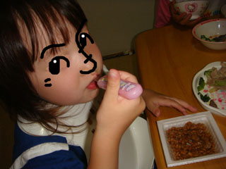 そして今日の夕食の時、おかずに納豆を出したら、チーコが「チーコもなっとう、たべる。」と。