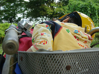 (子乗せ自転車なので、カゴは椅子になっています。)