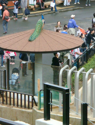 孔雀は、何羽かが園内を歩いています。