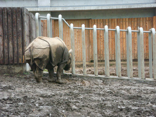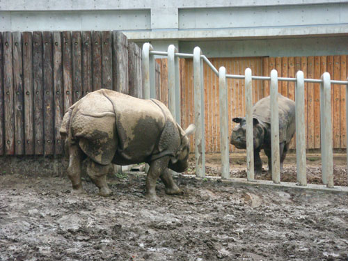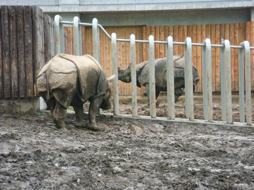 さて、サイが2頭、柵越しににらみ合っています。