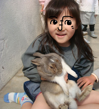 ぴよ子がうさぎを抱っこ。