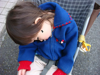 ちび子の体をピンと伸ばし、さらには「手はここね。」と手を体の脇にくっつけて、