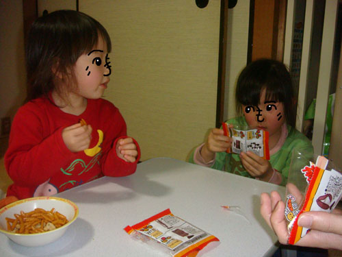 ちび子が残した柿の種を、ぴよ子が食べてしまいました。