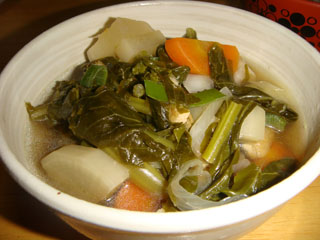 ・昨日の夕食の大根と大根の葉っぱ諸々の煮物(左)