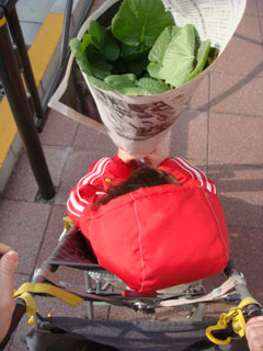 スーパーを出たらちび子をバギーに乗せ、今度は農家の野菜直場所へ。