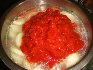 ・骨付き鶏肉を、トマト(またはケチャップ)で煮る。