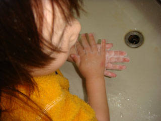 帰宅後、ちび子は石鹸で手を洗っていました。