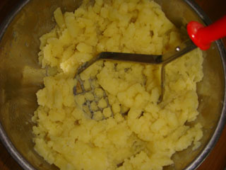 火の通ったジャガイモを、マッシャーで潰しました。