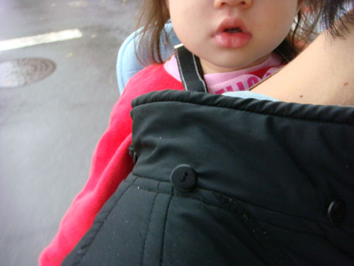 冷たい雨だったので、ちび子をおんぶで幼稚園に行く事にしました。