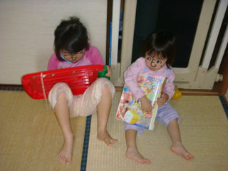 ぴよ子はお絵かき、ちび子は読書。