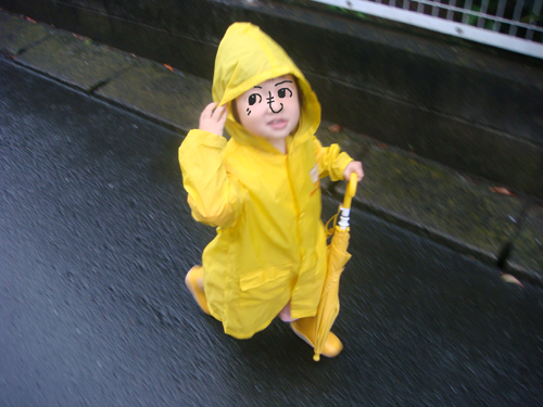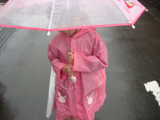ちび子に雨合羽・長靴・傘の完全装備で、