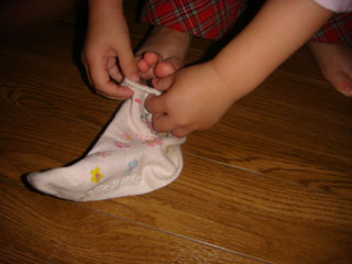 ←ちび子、自分で靴下を履くのに挑戦です!
