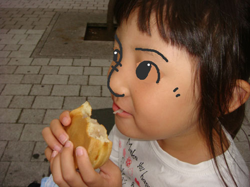大判焼きを3個購入し、公園のベンチで3人で食べました。
