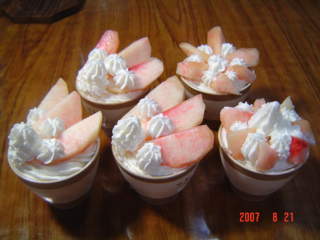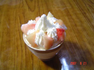 ぴよ子がその上に桃を飾り、ホイップを絞りました。