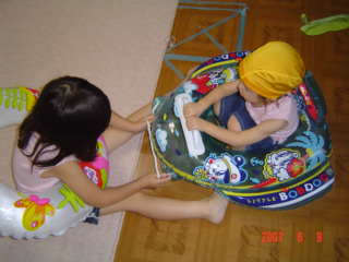 ぴよ子は、屋外のプールは足が届かないので浮き輪で浮んで遊び、
