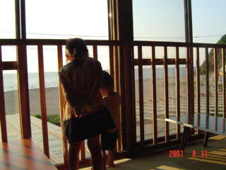 泳ぎ終った後、浜茶屋から海を眺める2人。