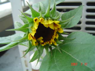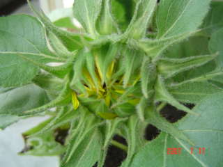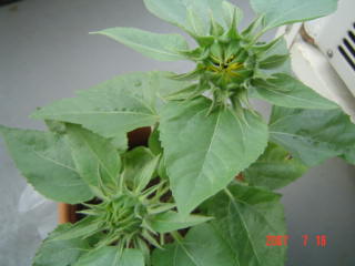 幼稚園のひまわりのつぼみが、少し開いてきました。