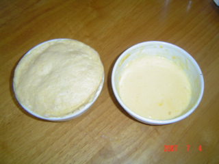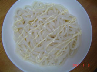 茹でたうどんの上に、マヨネーズを掛けます。