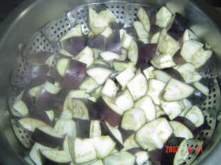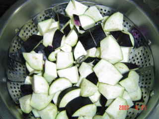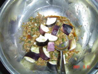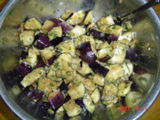 5、蒸かしたナスを入れたら、混ぜ合わせてください。
