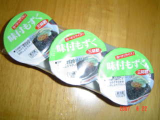 4、3連もずくのパッケージを剥いて、蓋を開けます。