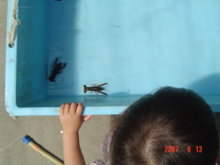 そのうち部屋の外に出て、年長さんが吊り上げたザリガニを見ていました。