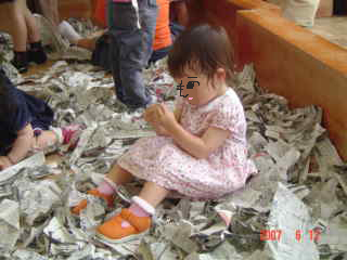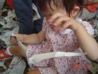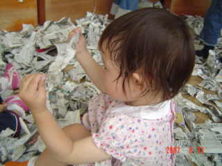 その後、遊戯室で新聞紙をちぎって遊ぶコーナーがあったので、そこへ行ったら、