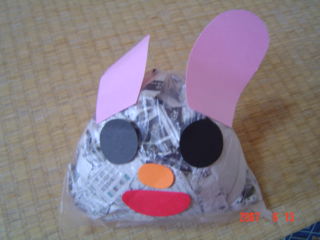その後、ちぎった新聞紙を使って、おもちゃを作りました。
