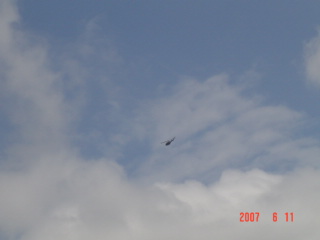 青空の中を飛ぶ、ヘリコプター