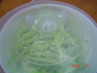 2.千切りした野菜を耐熱皿に入れ、穴を開けたラップ(またはレンジ用蓋)をして、