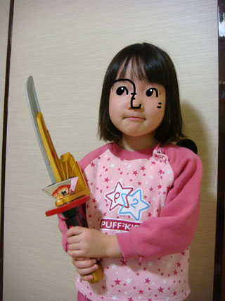 サンタさんからもらったシンケンマルを持ってポーズ。