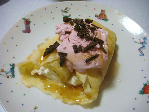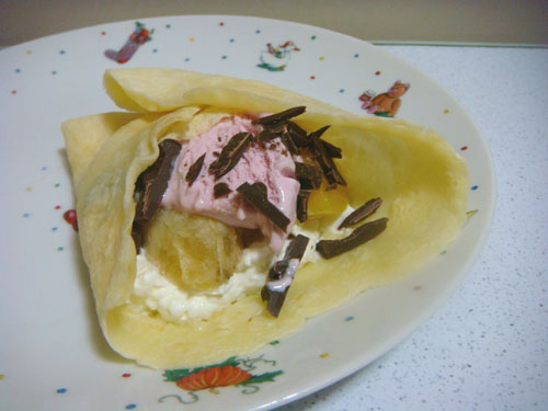 クレープを巻いて、上にアイスとチョコを乗せ、