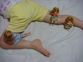 ヨーコが寝ているチーコにお人形を乗せて遊んでいました。
