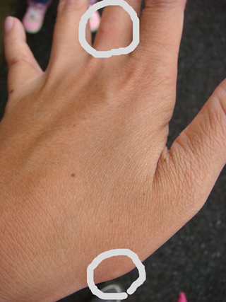 左手に2ヶ所・首に1ヶ所・左足首に1ヶ所の、計4ケ所です。