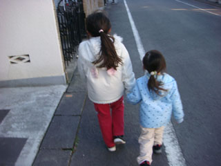 道を曲がって前方を見たら、遠くにヨーコがお友達と歩いているのが見えました。