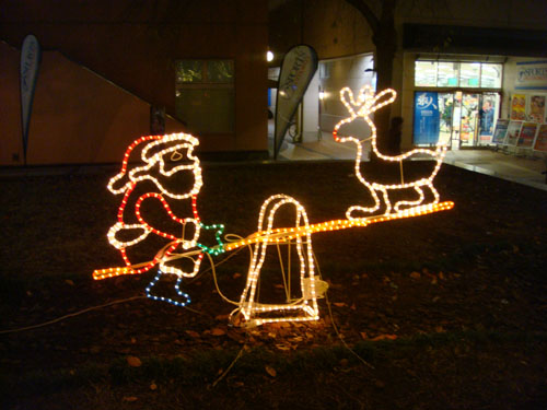 シーソーに乗るサンタとトナカイ。
