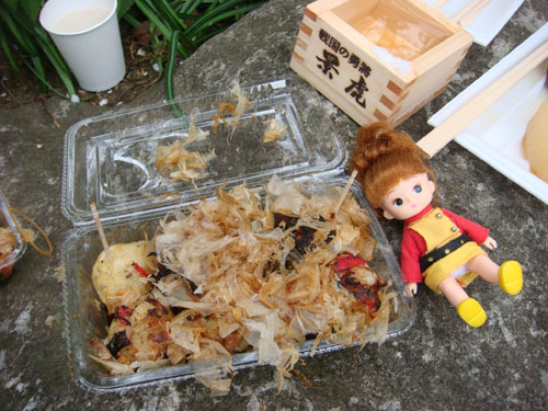 たこ焼きも、マスに入った日本酒(越乃景虎)も、