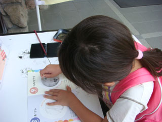 『1時半から、ウォッチングセンター内のホールで、缶バッジの製作を行います。