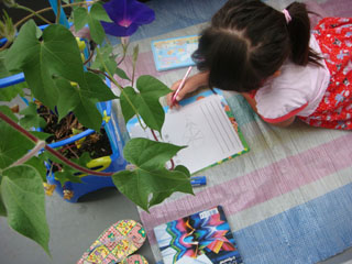 朝と同じように、ベランダでつぼみの朝顔を書いてもらいました。