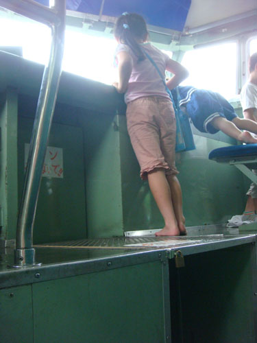 座席に正座してから、足を前に出します。