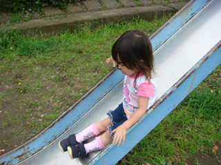 今日は、滑り台の降りるところに真っ先に行って、