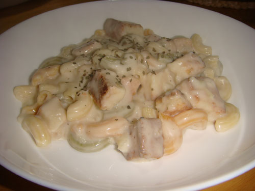 2.マカロニを茹でて、茹で上がったらホワイトソースに投入してからめる。