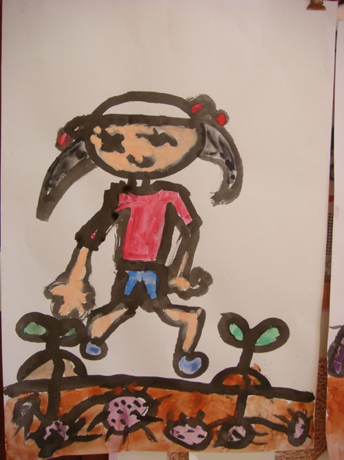 ぴよ子ちゃんの絵、いつもは「せんせい」に書いたのを見る事が多いですが・・・絵の具だと 迫力が違います! 「楽しい!うれしい!」が 色にもタッチにも出ているように見えます。