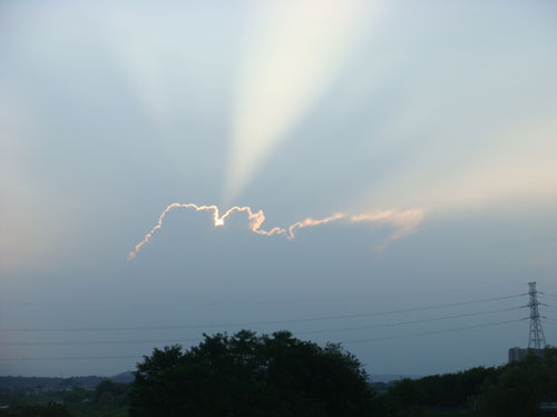 帰り道、西の方角を見たら、傾きかけた太陽が雲に入り込んで、